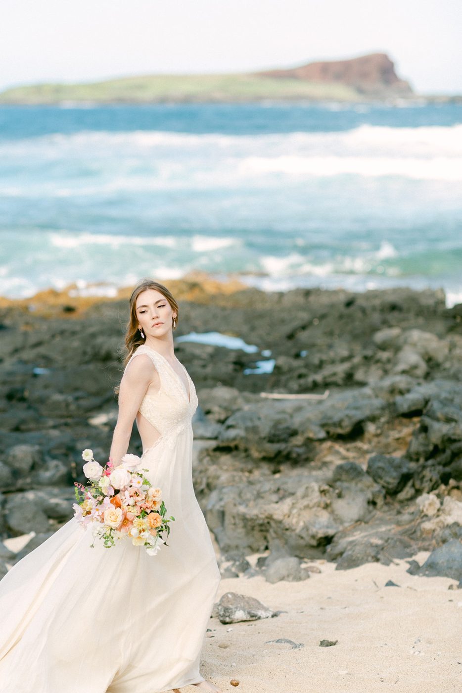 The delicate romance of European blooms mingles with the wild beauty of O‘ahu’s coastal scenery in this latest editorial feature, styled by Hawai‘i floral designer Debbie Hemingway.